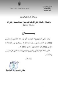 أعلن مفتي الجمهورية التونسية في بلاغ رسمي، أنّ اليوم الخميس 3 مارس، هوّ المتمّم لشهر رجب من سنة 1443 هجري.