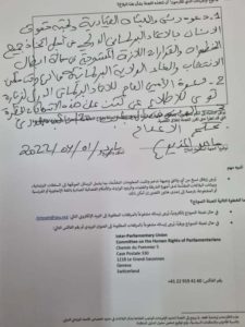 وتأتي شكوى مذيوب، من “أجل ابطال إلغاء ولاية برلمانية تعسفيا و120 نائب مهددين بالإعدام”.