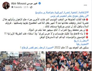 وقالت موسي، في تدوينة نشرتها على صفحتها الرسمية بموقع التواصل الاجتماعي “فيسبوك”، أنّ “مخطط ربيع الخراب 2″، حسب وصفها، لن يمرّ”، في إشارة إلى مشروع رئيس الجمهورية، قيس سعيّد.