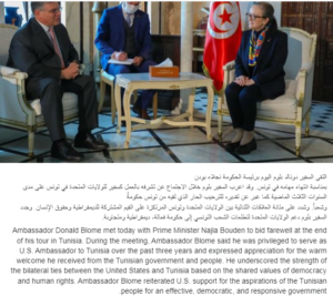 وجدد السفير بلوم “دعم الولايات المتحدة لتطلعات الشعب التونسي إلى حكومة فعالة، ديمقراطية ومتجاوبة”.