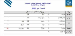 أعلن المعهد الوطني للرصد الجوي اليوم السبت 7 ماي عن القائمة الأولية لكميات الأمطار المسجلة خلال الـ 24 ساعة الماضية على كامل تراب الجمهورية.