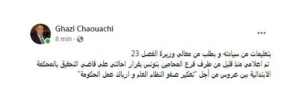 وأشار الشواشي، في تدوينة على صفحته على فيسبوك، إلى أنّ هذه الإحالة جاءت بـ “تعليمات من سيادته وبطلب من معالي وزيرة الفصل 23”.