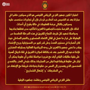 الترجي الرياضي التونسي يوجّه رسالة خاصّة إلى جماهيره