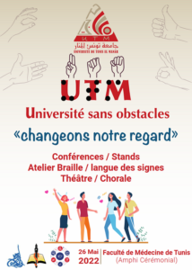 تنظم جامعة تونس المنار يوم 26 ماي 2022 بكلية الطب بتونس يوما تحسيسيا لفائدة طلبتها من ذوي الصعوبات على مستوى البصر وهم من طلبة المدرسة العليا لعلوم وتقنيات الصحة بتونس في اختصاص تقويم الأعضاء..