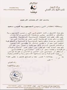 وطالب الغنوشي، سعيّد، بتشريكه رفقة حزبه في الحوار الوطني، الذي إنطلق حديثا، دون إقصاء أيّ كان.