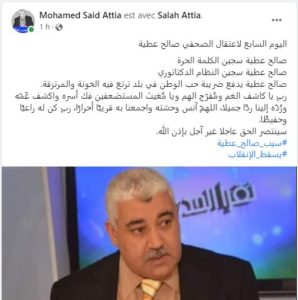 نشر محمد سعيد عطية، إبن الإعلامي المعتقل صالح عطية، تدوينة مؤثرة على حسابه بموقع التواصل الإجتماعي “فيسبوك”، في اليوم السابع، منذ إحتجاز والده.