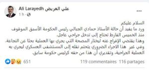 وأشار علي العريض، في تدوينة على حسابه بموقع التواصل الإجتماعي “فيسبوك”، إلى أن هذا يقتضي الإفراج عنه، ليختار المصحة التي يجري فيها العملية بحثا عن النجاعة، وفق قوله.