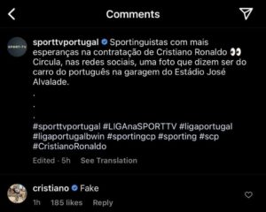 وعلّق “رونالدو” على الحساب الرسمي لقناة Sport tv البرتغالية، والتي تداولت نبأ عودته لسبورتينغ لشبونة، قائلا: “كذب”.