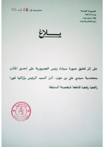 أعلنت ولاية سيدي بوزيد، أن رئيس الجمهورية، قيس سعيّد، أذن بإزالة صورته التي تمّ وضعها فوق صومعة بمعتمدية سيدي علي بن عون، فورا.