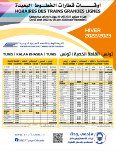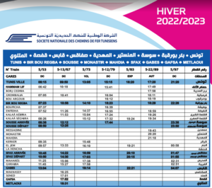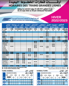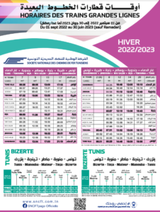أعلنت الشركة الوطنية للسكك الحديدية التونسية، عن أوقات قطارات الخطوط البعيدة، في شتاء 2022-2023، بداية من اليوم الخميس وإلى غاية 30 جوان 2023.
