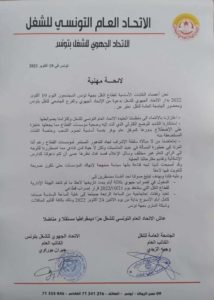 أصدرت نقابات النقل بتونس الكبرى، التابعة للإتحاد العام التونسي للشغل، لائحة مهنية تلوّح من خلالها بإضراب جهوي لمدة 3 أيام، يحدّد تاريخها لاحقا مالم تتّخذ الهيئة الإدراية لقطاع النقل، التي ستنعقد يوم 21 أكتوبر قرار إضراب قطاعي.