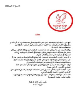 طالب “حزب الراية الوطنية” بوقف “التلاعب بعواطف التونسيين، وتجنيبهم فن المهاترات السياسو ــ رياضوية.، وفق توصيف الحزب”..