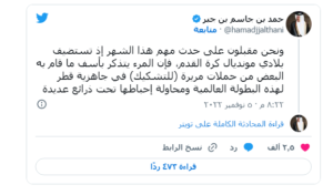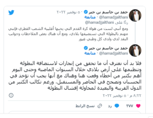 وشدد حمد بن جاسم على أنه رغم تكالب الكثير من الدول القريبة والبعيدة لمحاولة إفشال بطولة كأس العالم، “من المهم أن نتفق أن قطر حققت إنجازاً مهماً وعملاً كبيراً يستحق الإشادة، وينبغي على الجميع استخلاص العبر والدروس”.