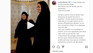 وقالت مارين الحيمر إنها مسلمة منذ عدة أشهر وليس في هذه الفترة، موضحة أنها متحفظة على هذا الأمر، وأن المقربين منها فقط يعرفون ذلك.