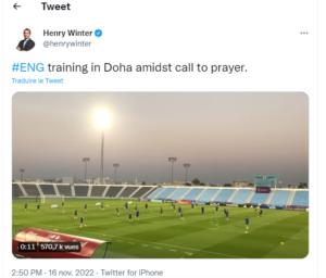 ونشر الصحفي الرياضي الإنجليزي، هنري وينتر، مقطع فيديو لتدريبات منتخب إنجلترا في مدينة الوكرة على حسابه الشخصي في موقع “تويتر”.