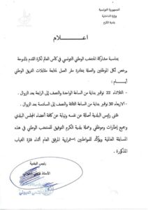 وأعلنت البلدية، في بلاغ لها، أنه سيتمّ السماح للموظفين والعملة بمغادرة العمل يومي الثلاثاء 22 نوفمبر بداية من الساعة الواحدة والنصف إلى الرابعة بعد الزوال، والإربعاء 30 نوفمبر بداية من الساعة الثالثة والنصف إلى السادسة بعد الزوال.