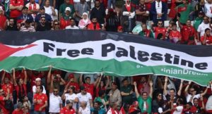 ورفع مشجعون تونسيون أعلاما أخرى لفلسطين، وارتدوا شارات بألوان “الكوفية الفلسطينية”.