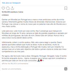 وقال رونالدو في البيان الذي ألمح فيه دون إعلان واضح عن اعتزاله اللعب دوليا، إن الفوز بكأس العالم كان أكبر حلم في مسيرته.