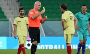 رئيس الــ “فيفا” يصفر مباراة استعراضية في كرة القدم.. ويمنح إنذارا لأحد اللاعبين البارزين