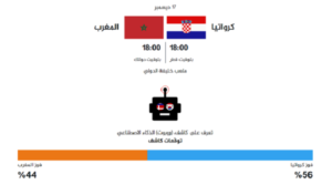 ويتوقّع “كاشف”، أن المباراة الترتيبية بين المغرب وكرواتيا – التي ستقام في ملعب خليفة الدولي السبت القادم على الساعة 20.00 بتوقيت تونس، تميل الكفة فيها إلى كرواتيا بنسبة 56%، مقابل 44% للمغرب، علمًا بأن المنتخبين تواجها في مباراة واحدة سابقة، وتعادلا فيها.