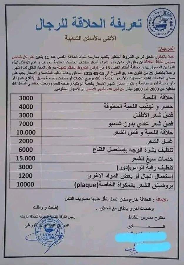 نشرت الغرفة النقابية الجهوية للحلاقة بأريانة، تعريفة الحلاقة الأدنى بالمناطق الشعبية، للرجال، وذلك عملا بملحق كراس الشروط، المتعلق بتنظيم ممارسة نشاط الحلاقة.