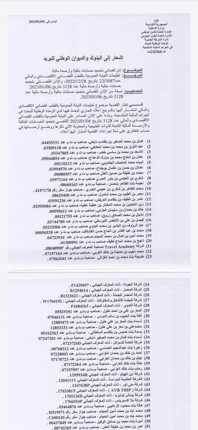 ويأتي قرار النيابة، بإذن قضائي، بناءا على الإذن الصادر على النيابة العمومية بالقطب القضائي عدد 3128 بتاريخ 6 جانفي 2023.