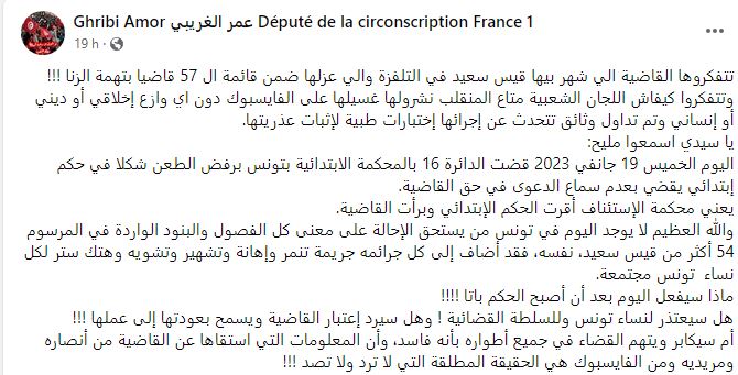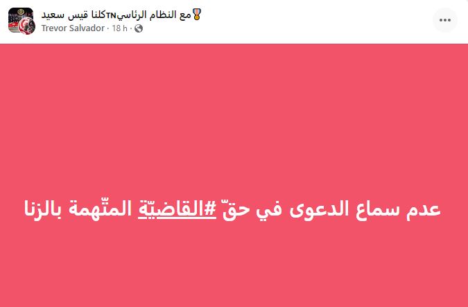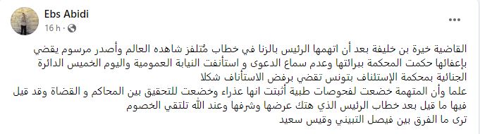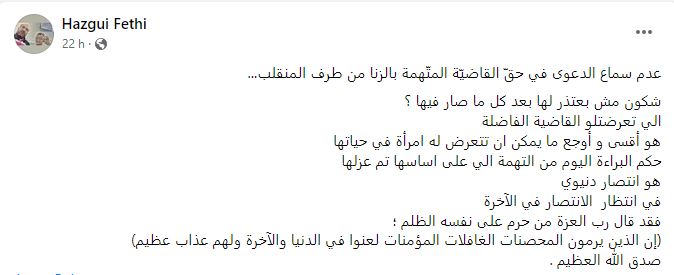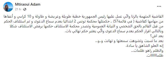 يذكر أن الدائرة الجناحيّة 16 لدى محكمة الإستئناف بتونس، أصدرت أمس، قرارا ” بالرفض شكلا” بخصوص الطعن في حكم ابتدائي، قضى بـ “عدم سماع الدعوى في حقّ قاضية معفيّة متّهمة بالزنا”.
