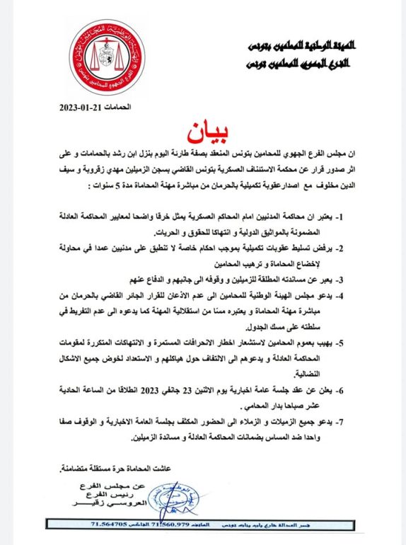وإعتبر مجلس الفرع الجهوي للمحامين بتونس، أن محاكمة المدنيين أمام المحاكم العسكرية يمثّل “خرقا واضحا لمعايير المحاكمة العادلة وانتهاكا للحقوق والحريات”، معبّرا عن رفضه لتسليط عقوبات تكميلية بموجب أحكام خاصة لا تنطبق على المدنيين عمدا في محاولة لإخضاع المحاماة وترهيب المحامين.