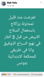 وذكرت مخلوف في تدوينة على فيسبوك، أنّ الأنفار الثلاثة، الذين لم تذكر تفاصيل عنهم، كانوا يحملون أسلحة بيضاء، وقد قاموا بعملية براكاج لها..