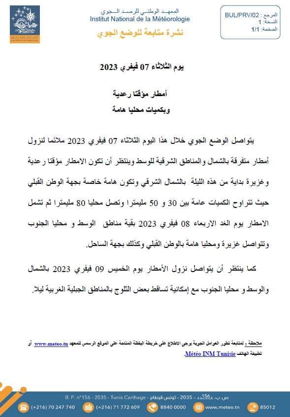حذّر المعهد الوطني للرصد الجوي، في نشرة إستثنائية، من أن الوضع الجوي يبقى ملائما لنزول أمطار متفرقة بالشمال والمناطق الشرقية للوسط.