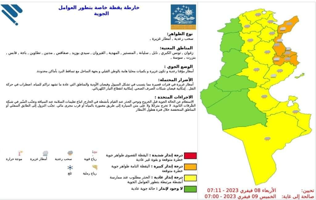 أعلن المعهد الوطني للرصد الجوي، عن إسناد “اللون البرتقالي” لولايات نابل، سوسة، المنستير والمهدية، في خارطة اليقظة المؤمنة بالموقع الرسمي للمعهد الوطني للرصد الجوي.