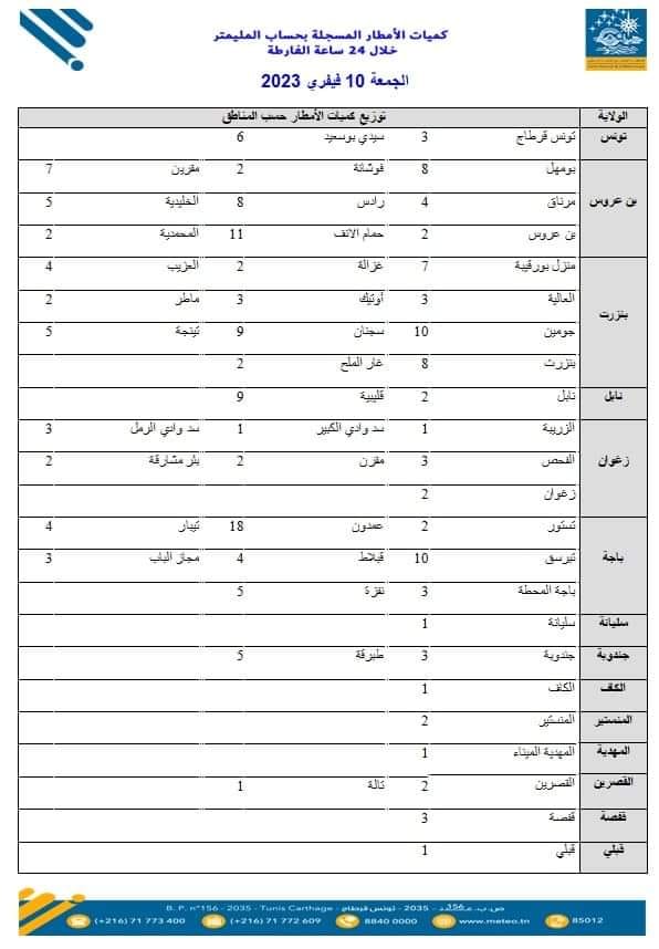 نشر المعهد الوطني للرصد الجوي، اليوم الجمعة، القائمة الأولية لكميات الأمطار المسجّلة، خلال الـ24 ساعة الفارطة.