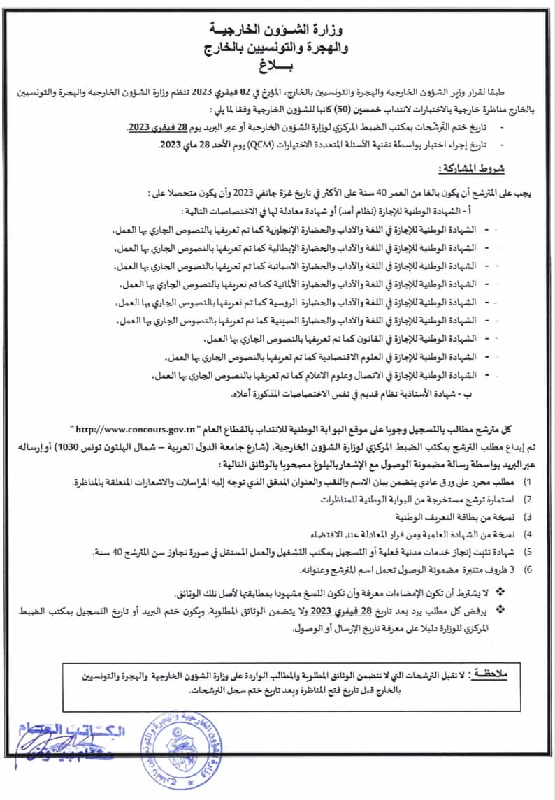 أعلنت وزارة الشؤون الخارجية والهجرة والتونسيين بالخارج، عن فتح مناظرة خارجية لإنتداب 50 كاتبا للشؤون الخارجية.