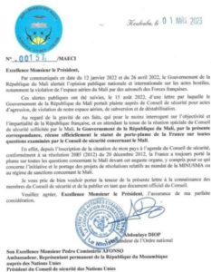 وفي رسالة بعثت بها الحكومة المالية في غرة مارس إلى بيدرو كوميساريو أفونسو، الرئيس الحالي لمجلس الأمن، وسفير موزمبيق لدى الأمم المتحدة، أعلنت فيها قرارها بسحب وضع فرنسا كصاحب قلم، للقرارات المتعلقة بمالي في مجلس الأمن.
