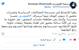 وفي سياق متصل، قالت سمية الغنوشي ابنة رئيس “حركة النهضة”، إن والدها قرر مقاطعة جلسات التحقيق رفضا للانخراط في مسرحية المحاكمات السياسية والجلسات التي لا تنتهي، بهدف الاستنزاف نفسيا وجسديا.