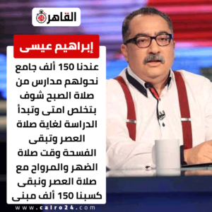 وقال عيسى خلال برنامجه “حديث القاهرة”، إن هناك نحو 150 ألف مسجد في مصر، ومن أجل حل أزمة اكتظاظ الطلبة بالمدارس، من الأفضل تحويل هذه المساجد إلى مدارس.