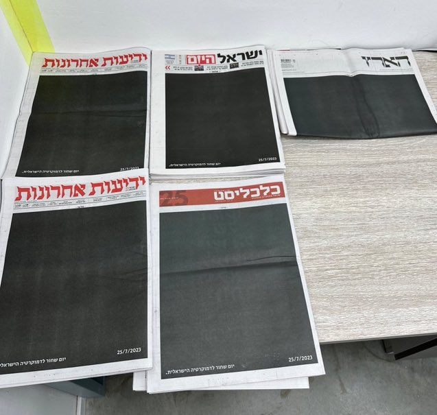 وتوحّدت صحف “يديعوت أحرونوت” و”كلكاليست” و”هآرتس” و”إسرائيل اليوم”، عبر إصدار عدد اليوم، بصفحات أولى لا تحتوي إلاّ على عنوان رئيسي موحّد باسم الصحيفة وتاريخها، وبقية الصفحة مطلية باللون الأسود.