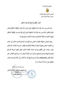 ودعا المجلس القضاة الذين تتوفّر فيهم شروط الترشّح لعضوية الهيئة، إلى إيداع ترشّحاتهم مباشرة الى كتابة المجلس أو عن طريق الفاكس ( الرقم: 70.201.228) وذلك بداية من اليوم الجمعة 8 سبتمبر، وذلك إلى غاية يوم 11 من الشهر نفسه، على الساعة الرابعة مساء.