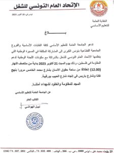 دعت الجامعة العامة للتعليم الأساسي، كافة النقابات الأساسية والفروع الجامعية القطاعية بتونس الكبرى، إلى المشاركة بكثافة في المسيرة الوطنية التي ينظمها إتحاد الشغل بالشراكة مع مكونات اللجنة الوطنية لدعم المقاومة في فلسطين.