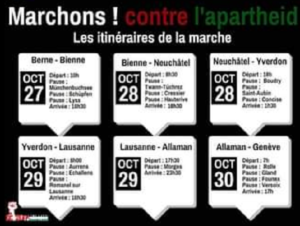 تنظم “مجموعة سويس من أجل فلسطين” مسيرة شبابية، مشيا على الأقدام، بداية من يوم أمس 27 أكتوبر، ستجوب عدة مدن في سويسرا.. ومن المنتظر أن تنتهي مسيرة المشي، يوم 30 أكتوبر الجاري..