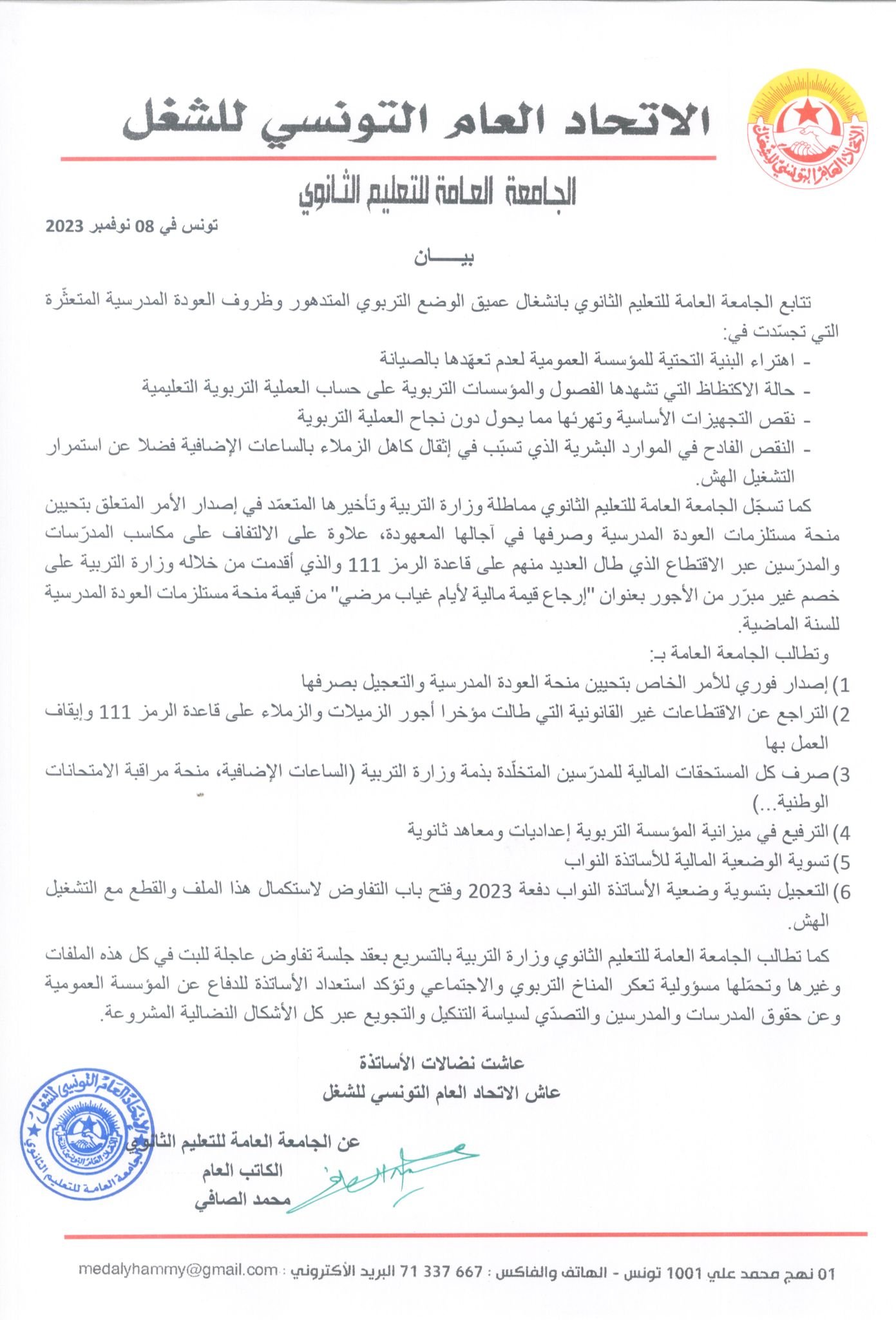 وطالبت جامعة التعليم الثانوي، أيضا، إلى الترفيع في ميزانية المؤسسة التربوية بصفة عامة.