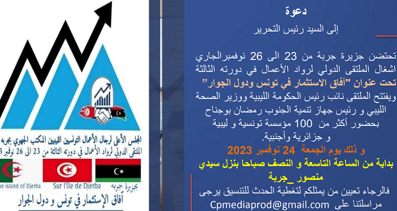ينظم المجلس الأعلى لرجال الأعمال التونسيين الليبيين، من 23 إلى 26 نوفمبر بجزيرة جربة، أشغال الملتقى الدولي الثالث لرواد الأعمال تحت شعار “ٱفاق الاستثمار في تونس ودول”.