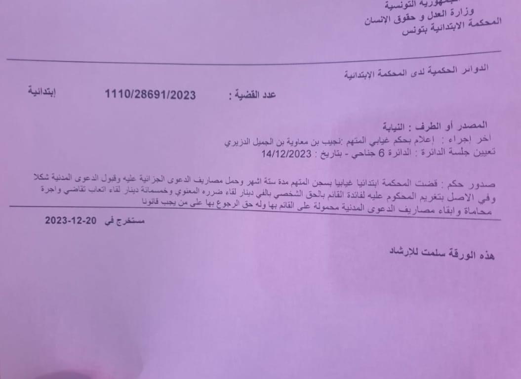 قضت المحكمة الابتدائية بتونس غيابيا، بسجن الناشط السياسي، نجيب الدزيري، ستة أشهر من أجل الثلب والقذف العلني.