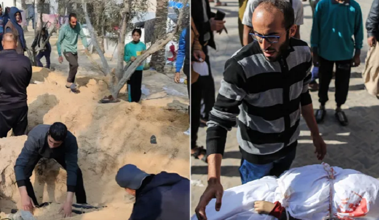 وقالت وزارة الصحة في غزة، إن المواطنين يضطرون لدفن 40 شهيدا في مقبرة جماعية بساحة مجمع ناصر الطبي..