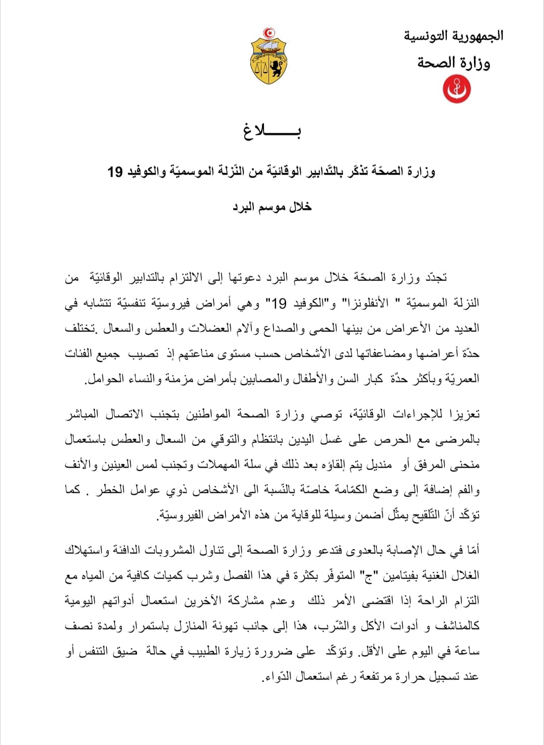 جدّدت وزارة الصحة، الدعوة للإلتزام بالتدابير الوقائية من النزلة الموسمية (القريب) و”الكورونا”.