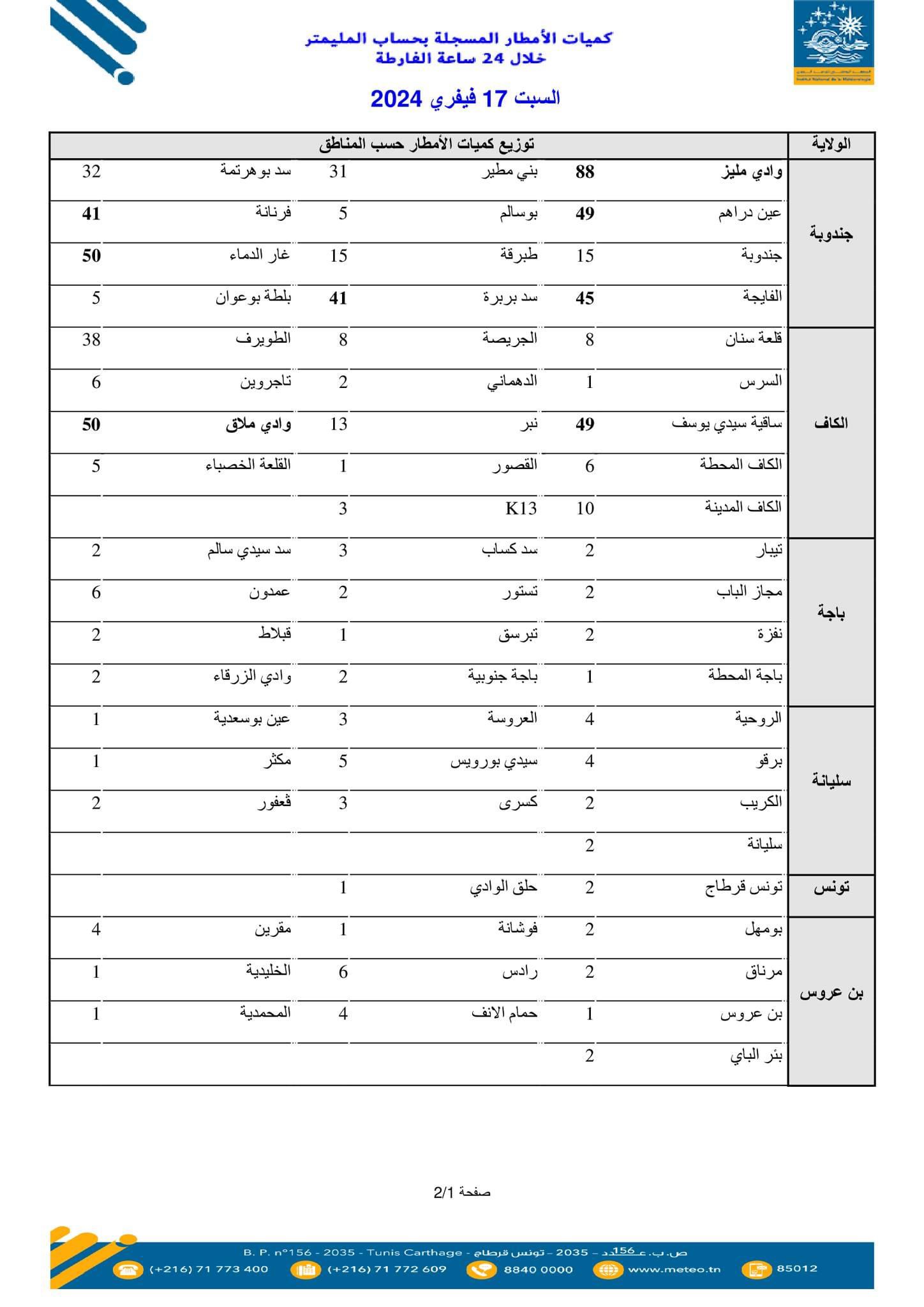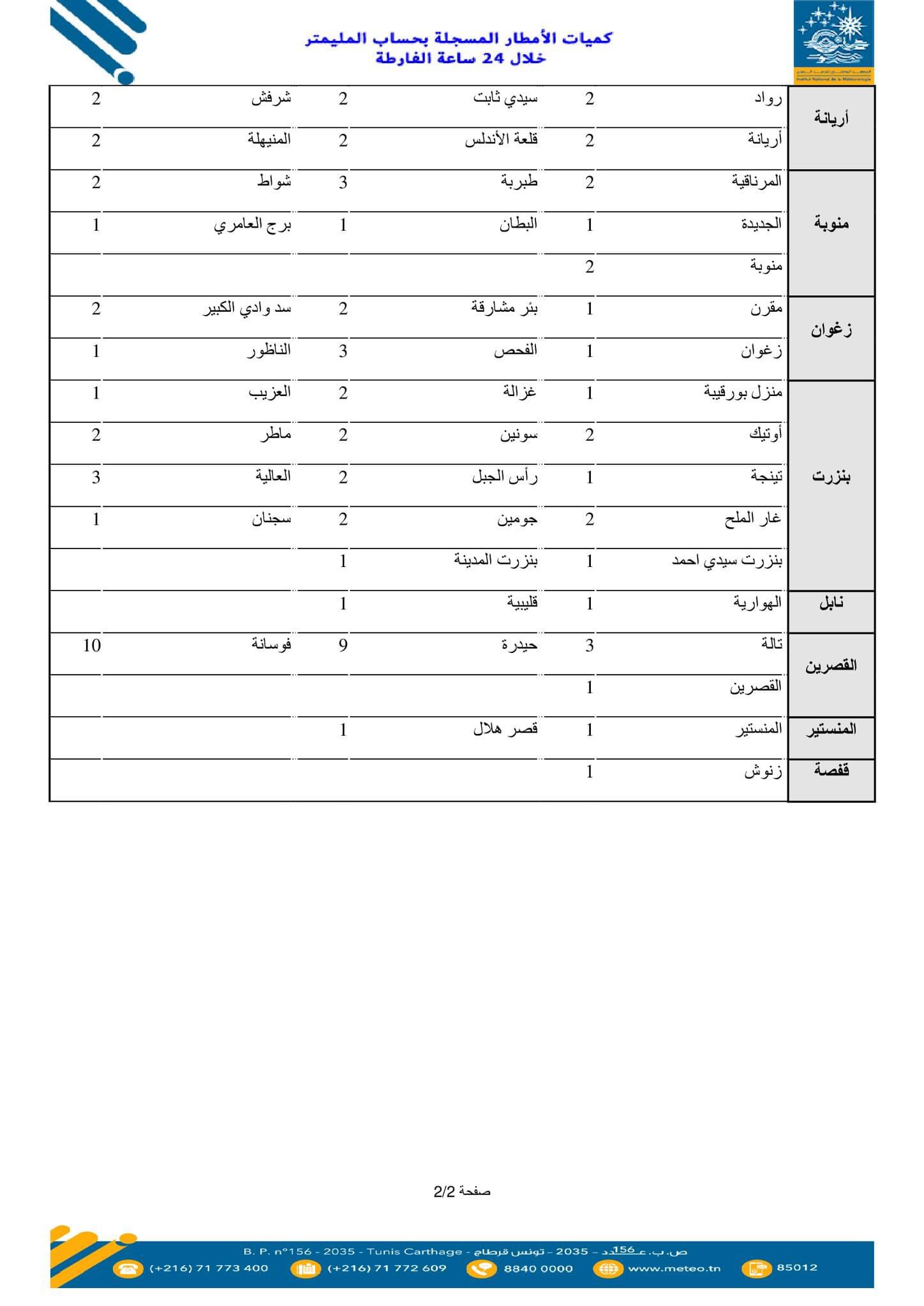 نشر المعهد الوطني للرصد الجوي القائمة الأولية، لكميات الأمطار المسجلة خلال 24 ساعة الفارطة.