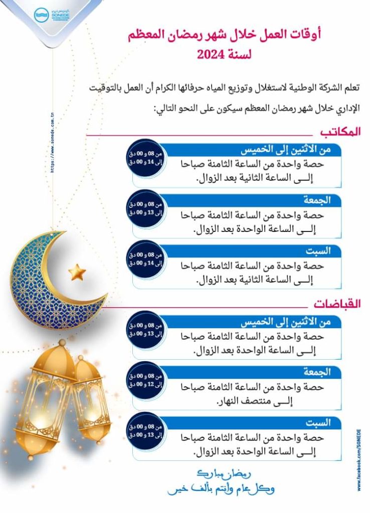أعلنت الشركة الوطنية لإستغلال وتوزيع المياه، في بلاغ لها، اليوم السبت، عن توقيت عمل مكاتبها وقباضاتها المالية، خلال شهر رمضان المبارك لسنة 2024 الموافق لسنة 1445هجري.
