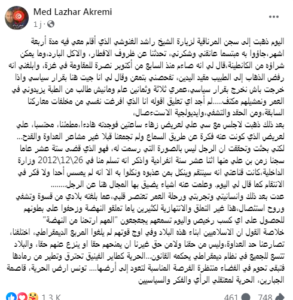 وفي خلاصة تدوينته، قال لزهر العكرمي: “إن الإسلاميين أبناء هذه البلاد، وفي أوج قوتهم لم يلغوا المربع الديمقراطي، اختلفنا، تصارعنا حد العداوة، وليس من حقنا ولا من حق غيرنا، أن يمنحهم حقا أو ينزع عنهم حقا، والبلاد تتسع للجميع في نظام ديمقراطي يحكمه القانون.. الحرية كطائر الفينيق تحترق وتطير من رمادها فتبقى تحوم في الفضاء منتظرة الفرصة المناسبة لتعود إلى أرضها.. تونس أرض الحرية، قاصمة الجبارين، الحرية لمعتقلي الرأي والفكر والسياسيين”.