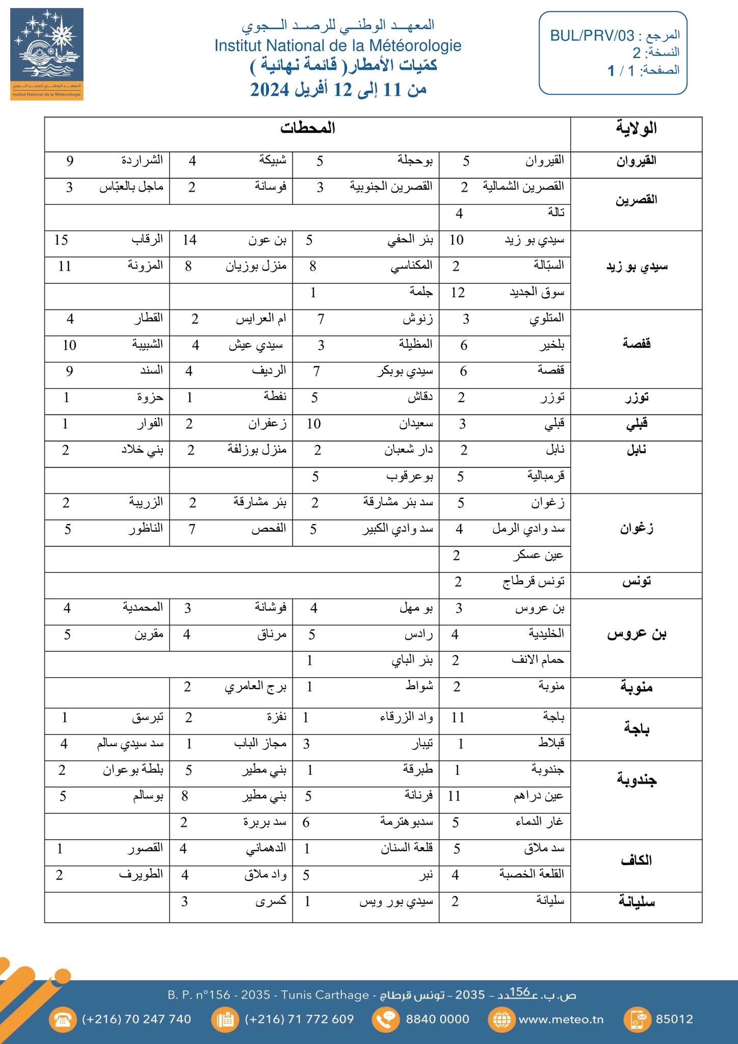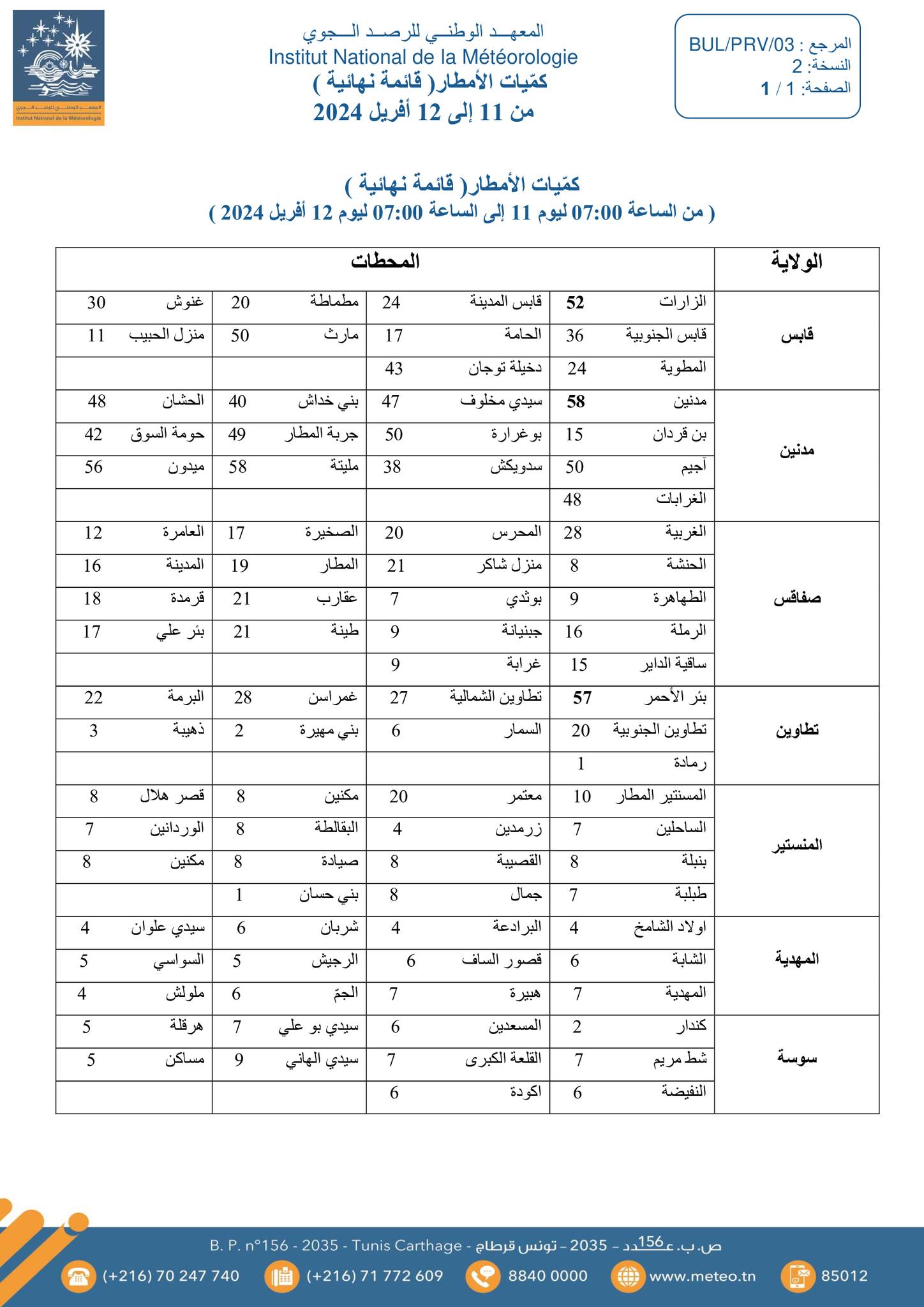 تساقطت بأغلب ولايات الجمهورية التونسية، كميات “هامّة” من الأمطار، حيث وصل أقصاها إلى 58 ملم بكل من مدنين ومليتة من ولاية مدنين، وفق ما أعلنه المعهد الوطني للرصد الجوي.
