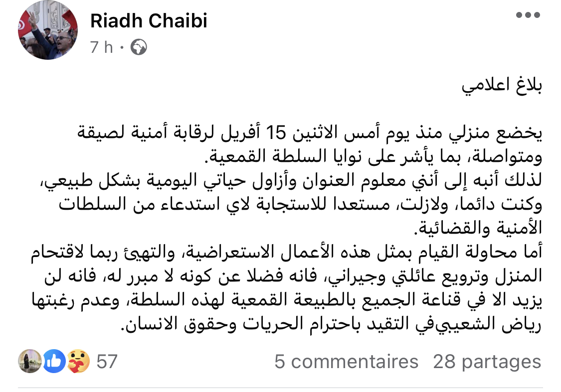قال القيادي في “حركة النهضة”، رياض الشعيبي، أن وحدات أمنية بصدد مراقبة منزله.